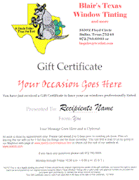 Create one online from Blair's Texas Window Tinting & more. You can make your own personalized gift certificate quickly and easily that you can make adding on the certificate who it's to, who it's from, add a brief message to be printed on it, and print it, right in front of your own computer! (how conveeeenient). |